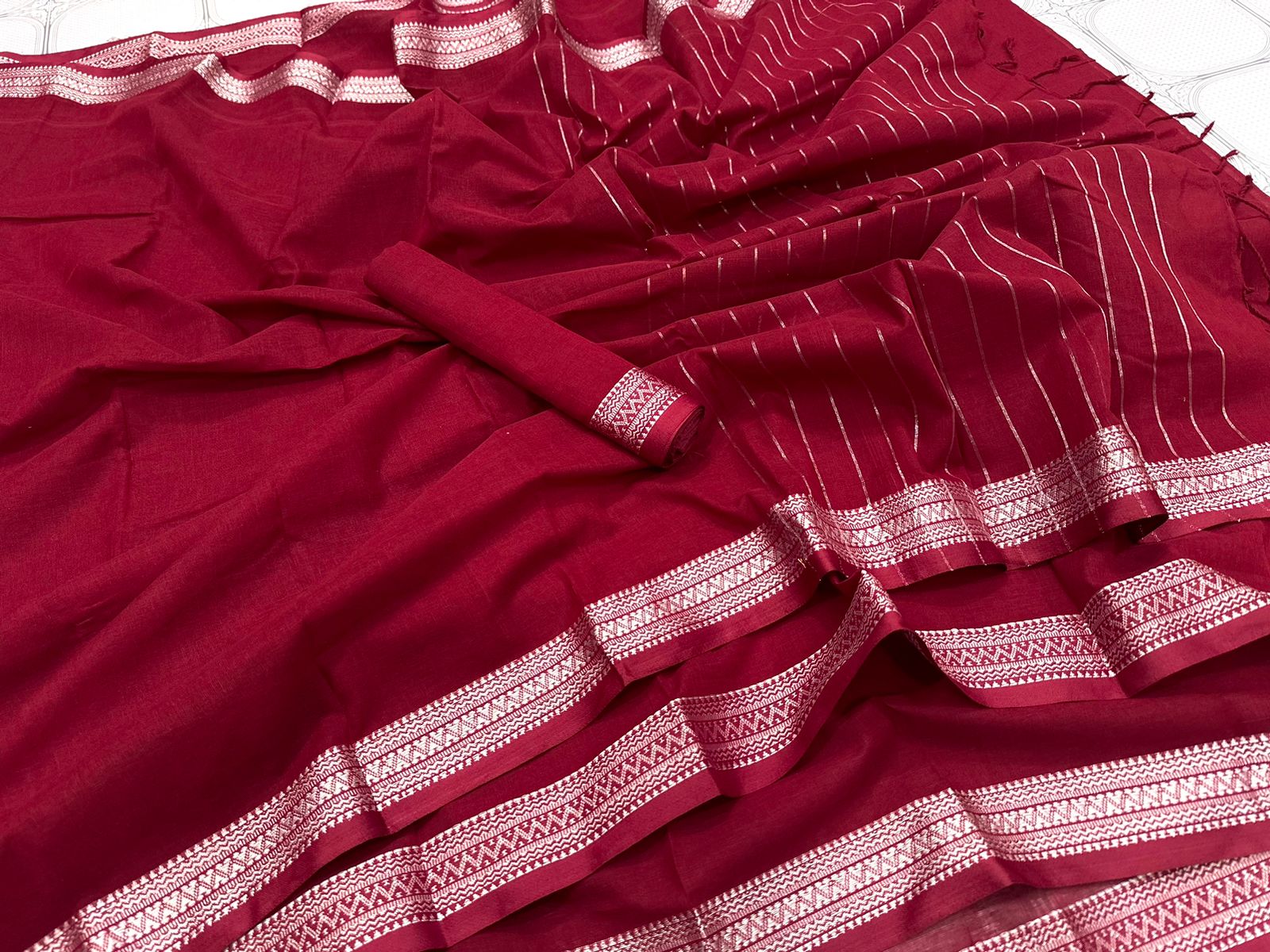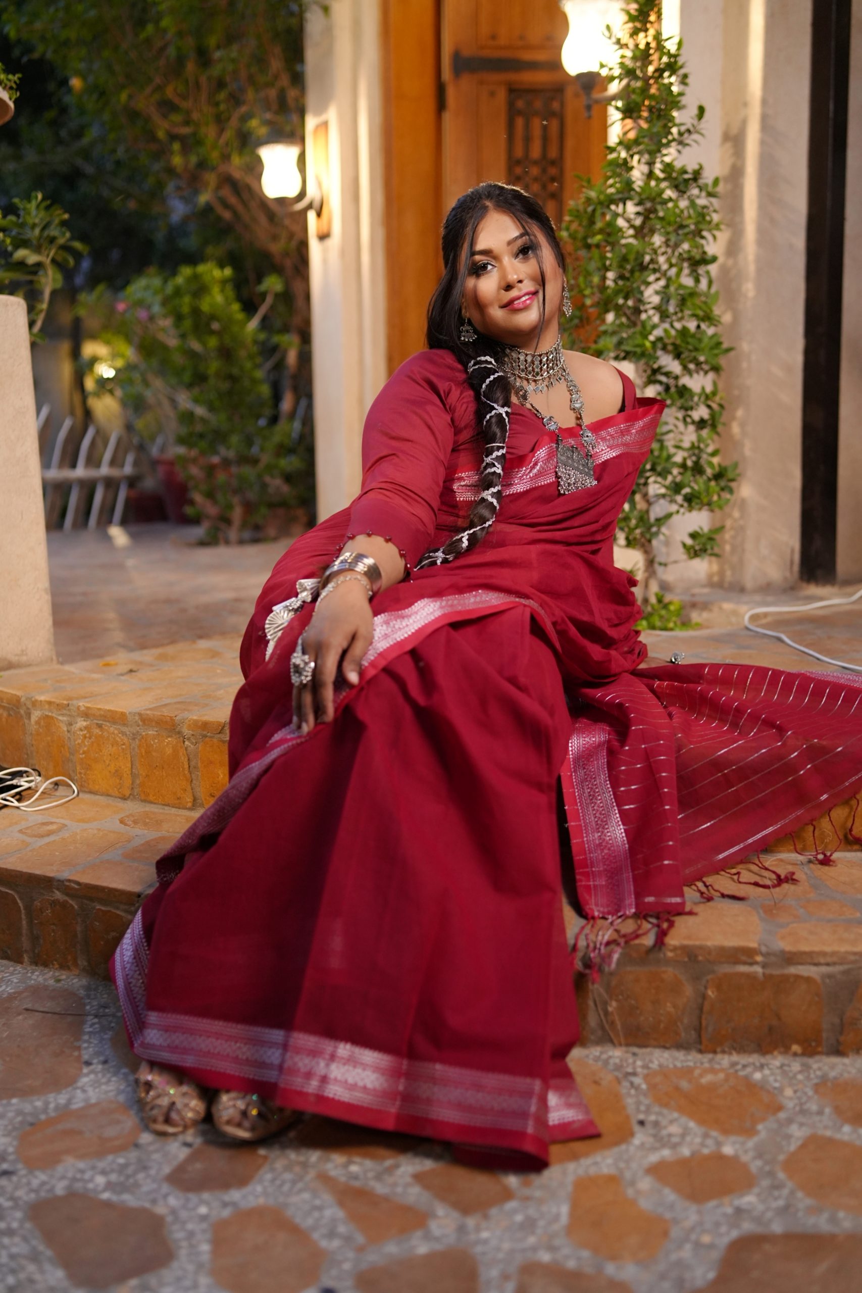 Indulge in understated luxury with this exquisite maroon cotton saree by Dilruba, where elegance meets everyday comfort. Crafted from finest imported premium cotton, this saree offers an exceptionally soft, breathable, and lightweight feel—designed to drape effortlessly and keep you comfortable throughout the day.